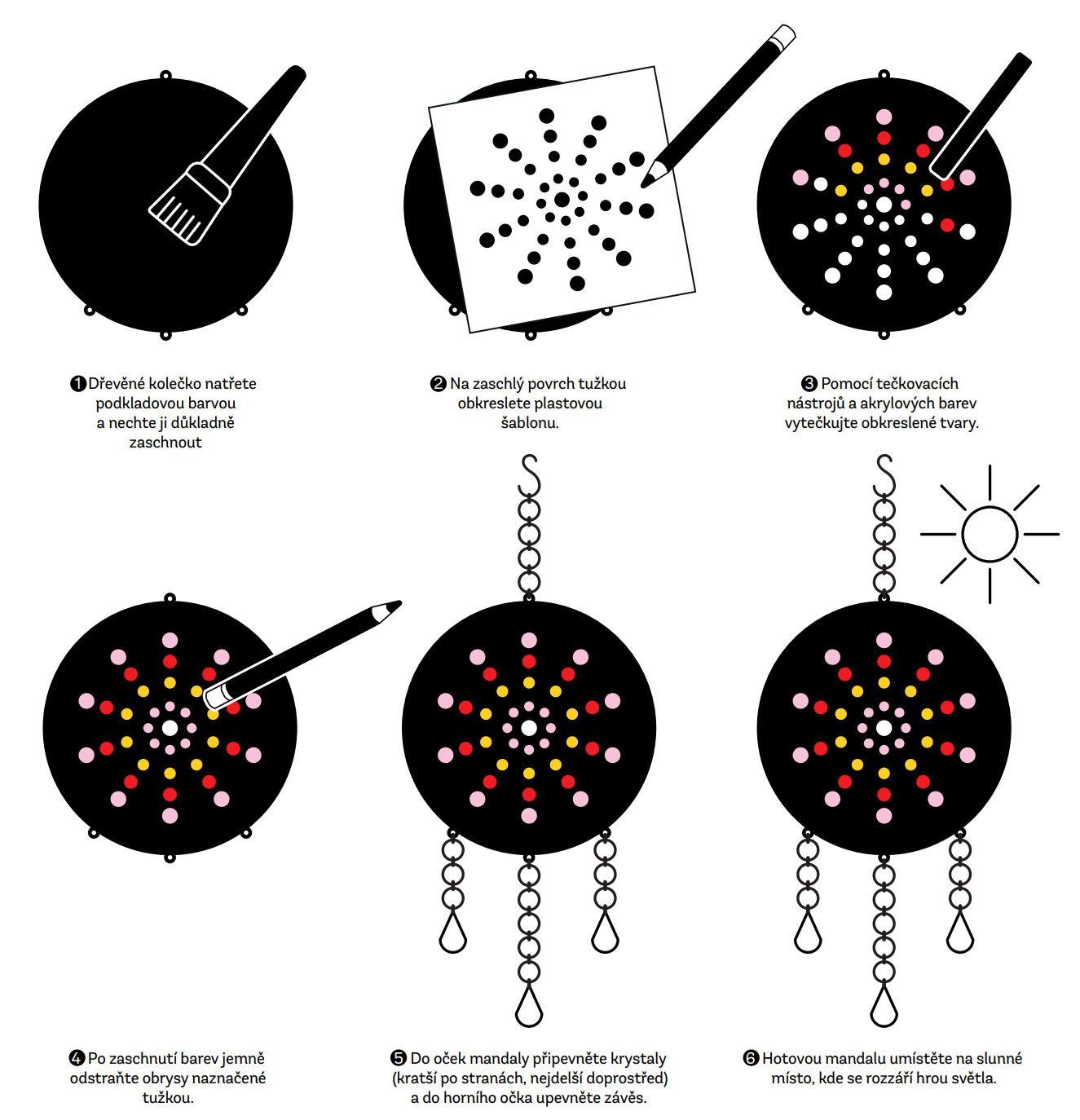 Tato sada obsahuje vše potřebné k vytvoření vlastní zářivé mandaly – od dřevěného kolečka a akrylových barev české výroby po tečkovací nástroje, šablony i krystaly, které rozptylují světlo do duhových odlesků a rozzáří tak celou místnost.