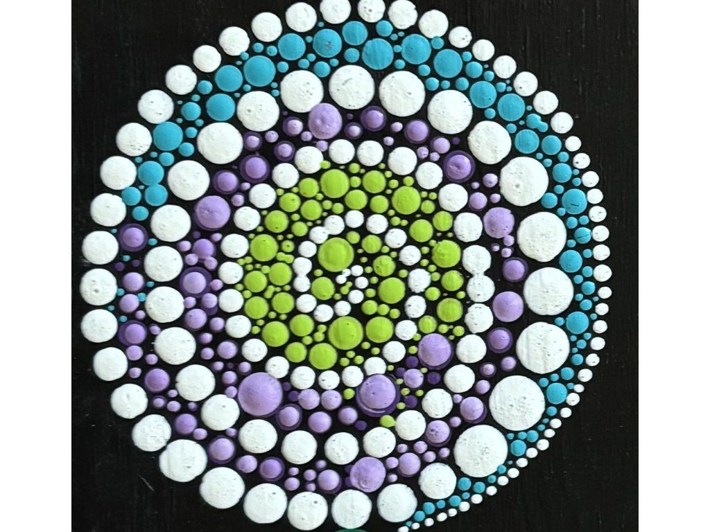 - Pomocí tečkovacích nástrojů a akrylových barev vytvořte mandalu (podle předkreslené šablony nebo vlastní fantazie).