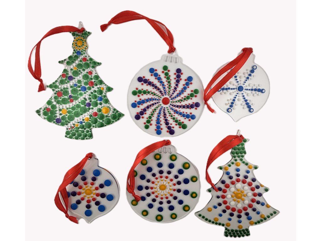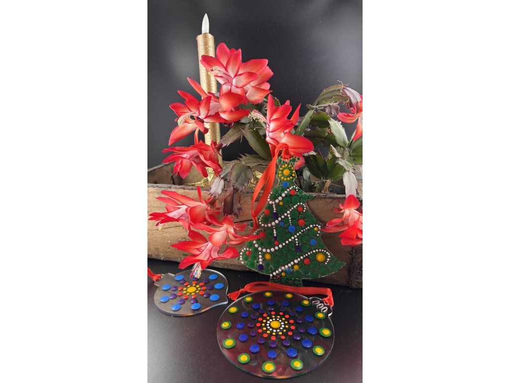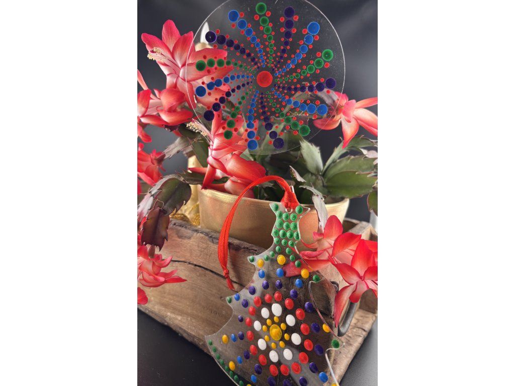 Tento kreativní způsob zdobení Vám umožní vyrobit osobité dekorace plné barev, klidu a soustředění. Každá tečka má své místo, a právě v jejich rytmu vzniká kouzlo sváteční atmosféry. Hotové ozdoby se hodí k zavěšení na stromeček, do okna nebo jako originální dárek.